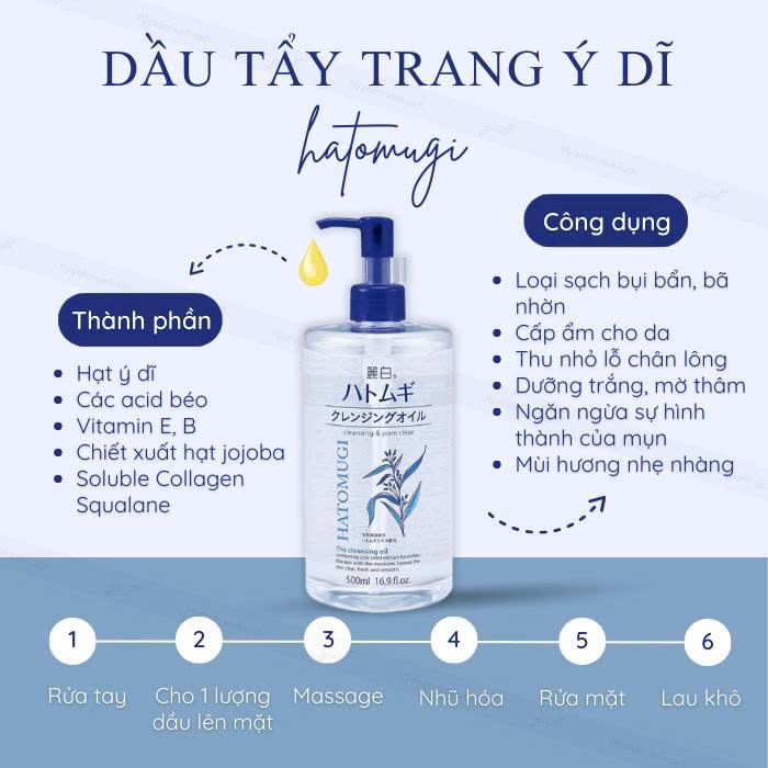 Kết cấu dạng dầu dễ dàng loại bỏ lớp trang điểm cứng đầu cùng bụi bẩn và dầu thừa bám sâu trong lỗ chân lông, trong khi vẫn duy trì độ ẩm cho da nhờ thành phần dưỡng ẩm tự nhiên chiết xuất từ hạt Ý Dĩ. Có thể dùng được cho cả da mặt khô và ướt