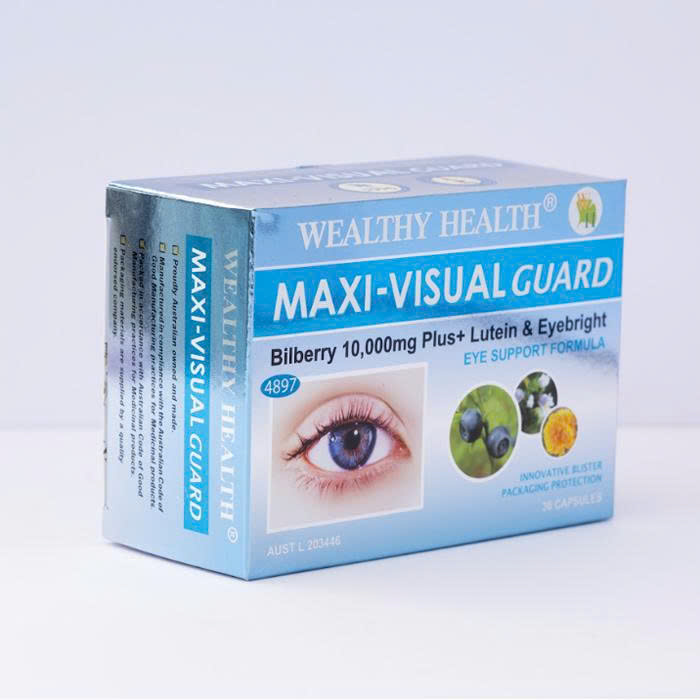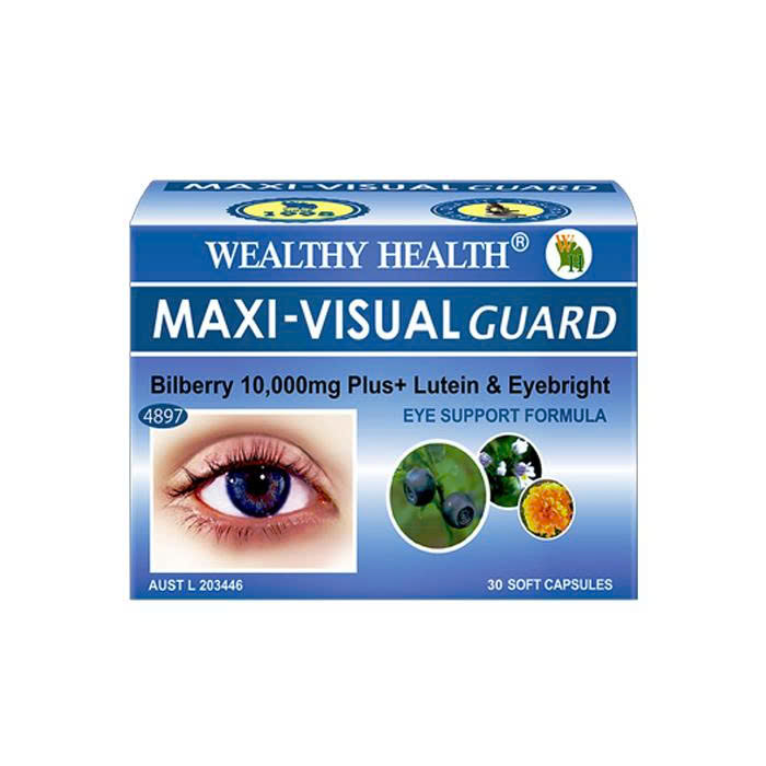 Viên uống bổ mắt Maxi-Visual Guard Bilberry 10000 Plus (Bổ mắt Wealthy Health) cung cấp các chất bổ chất lượng cao với các thành phần hoạt tính bao gồm việt quất đen, lutein và Eyebright đã cho thấy hiệu quả trong việc hỗ trợ thị lực và chức năng mắt khỏe mạnh.
